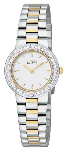 You Save : 40% Citizen Eco-Drive Two-tone Silhouette Crystal Mother-of-Pearl Dial Women's Watch #EW9824-53A Dress watch, Two-hand solar-powered movement featuring Eco-Drive technology, Insufficient charge warning and overcharging prevention features, Polished gold-tone hour and minute hands, Applied and polished gold-tone teardrop/baton markers, Polished silver-tone stainless steel small round case embellished with Swarovski® crystals, Polished gold-tone crown, Stainless steel caseback, 30 meters/100 feet water resistant